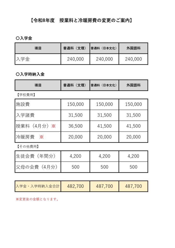 授業料と冷暖房費の変更について、以前よりパンフレットでお伝えしておりましたが、昨年の年末に許可がおりましたので、ここにご案内いたします。